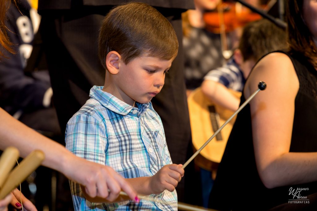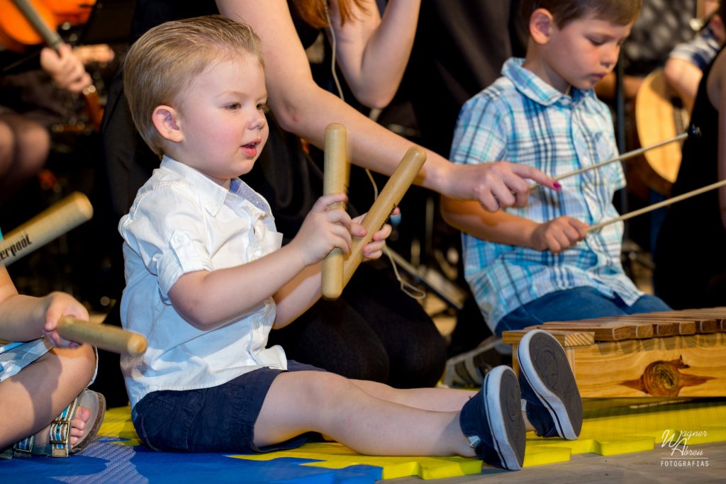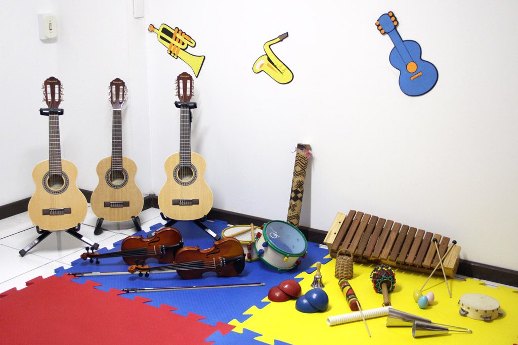 - Em todas as aulas as crianças exploram os instrumentos de percussão, piano, violino, violão, utilizando repertorio de canções folclóricas, pop, temas de filmes e música clássica;